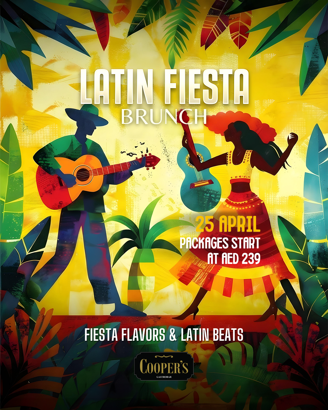 Turn your Saturday up a notch at the Latin Fiesta Brunch at Cooper’s on 25 April, from 12pm to 4pm. Expect bold Latin flavours, free-flowing vibes, and live Latin beats by the Skyline Band bringing the energy all afternoon. It’s laid-back, lively, and just the right amount of fiesta. Packages start from AED 239 — round up your crew and make it a brunch to remember.